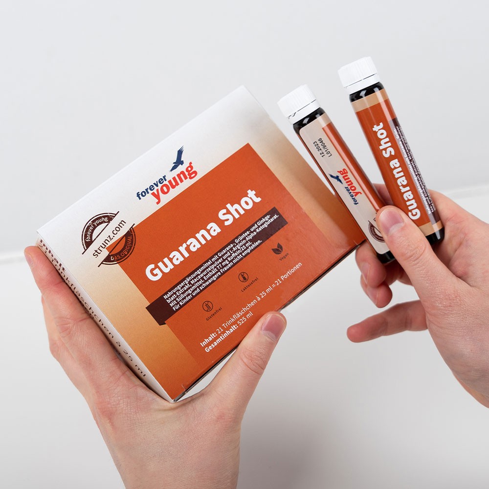 Der forever young Guarana Shot ist ein flüssiges Nahrungsergänzungsmittel und ein idealer Begleiter für unterwegs.